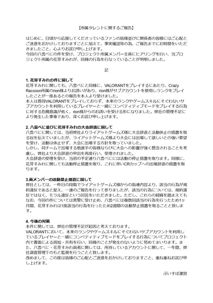 この騒動を受けて、花芽すみれは2週間の活動停止処分となりました。