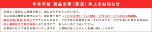 12月29日(金)~1月3日(水)・1月9日(火)~1月14日(日)の期間、商品出荷(発送)を休止となるようです。